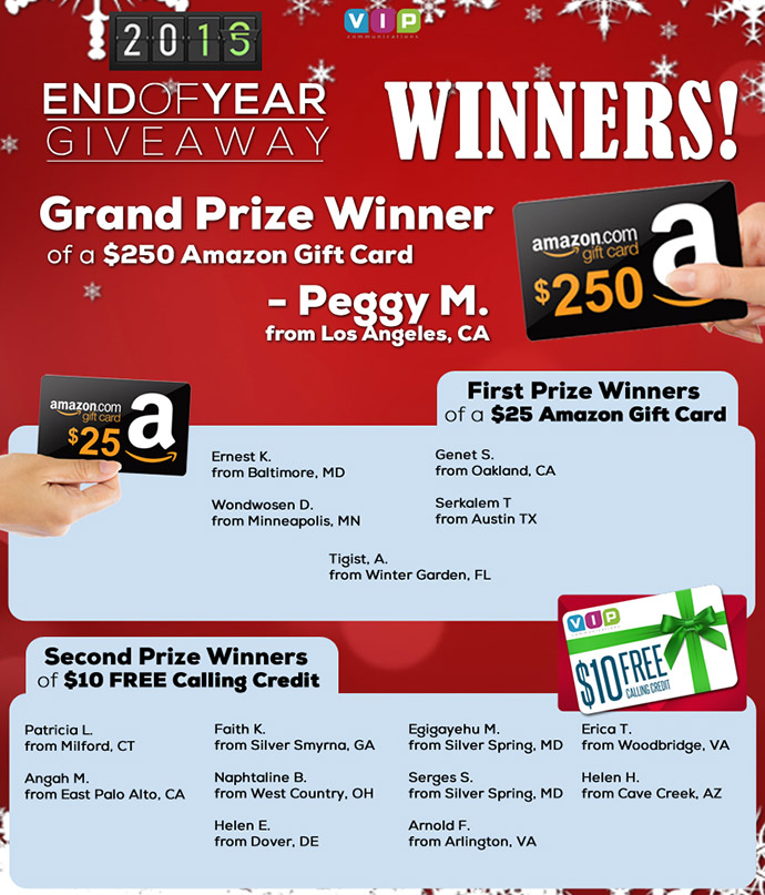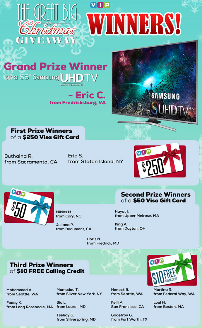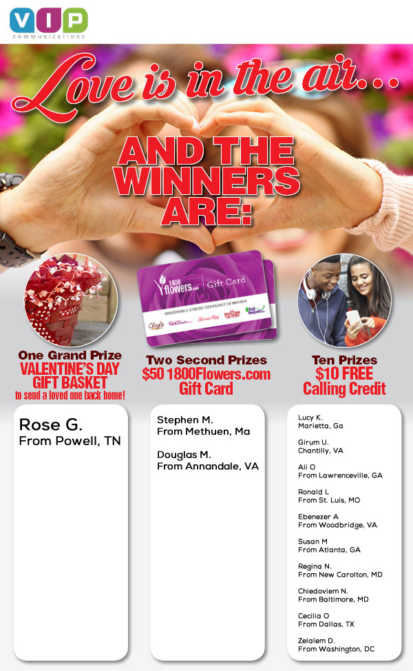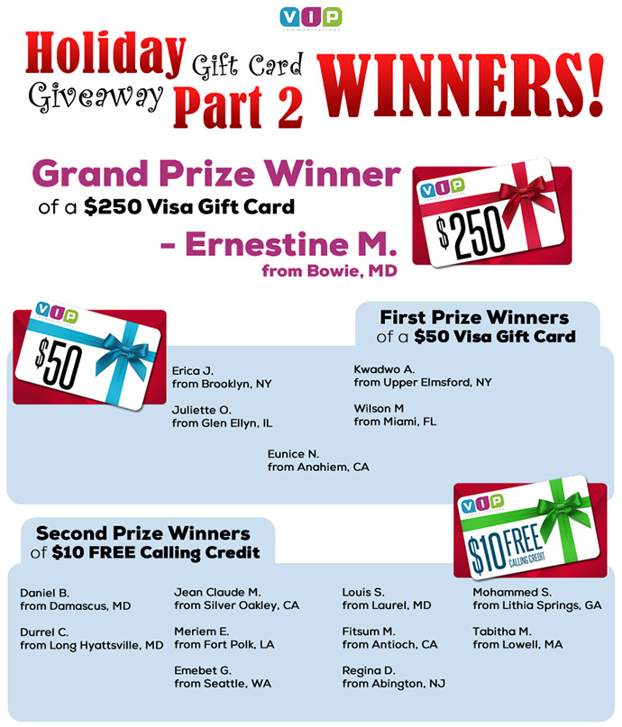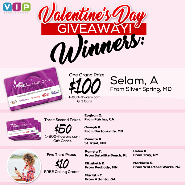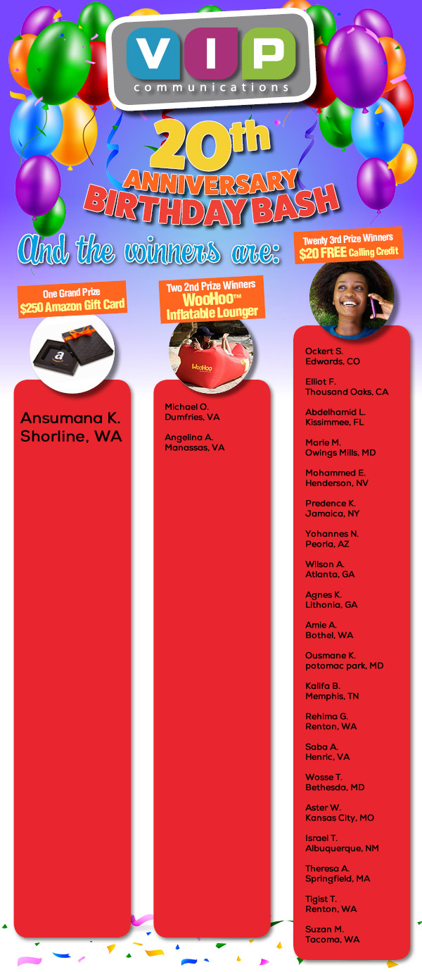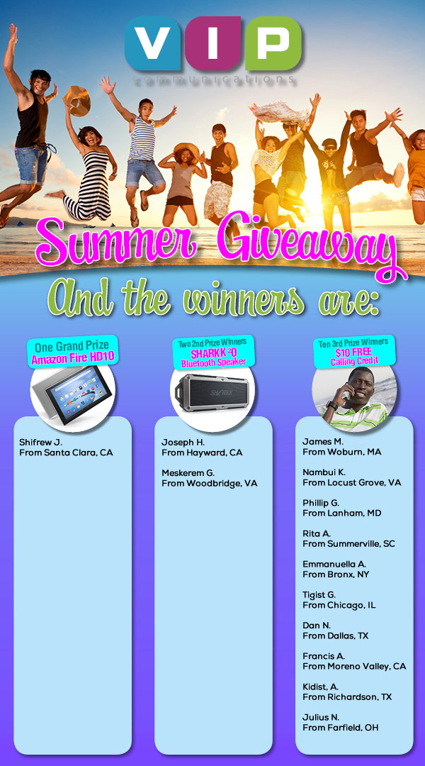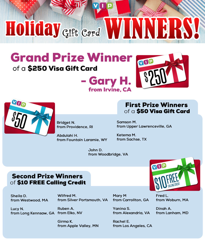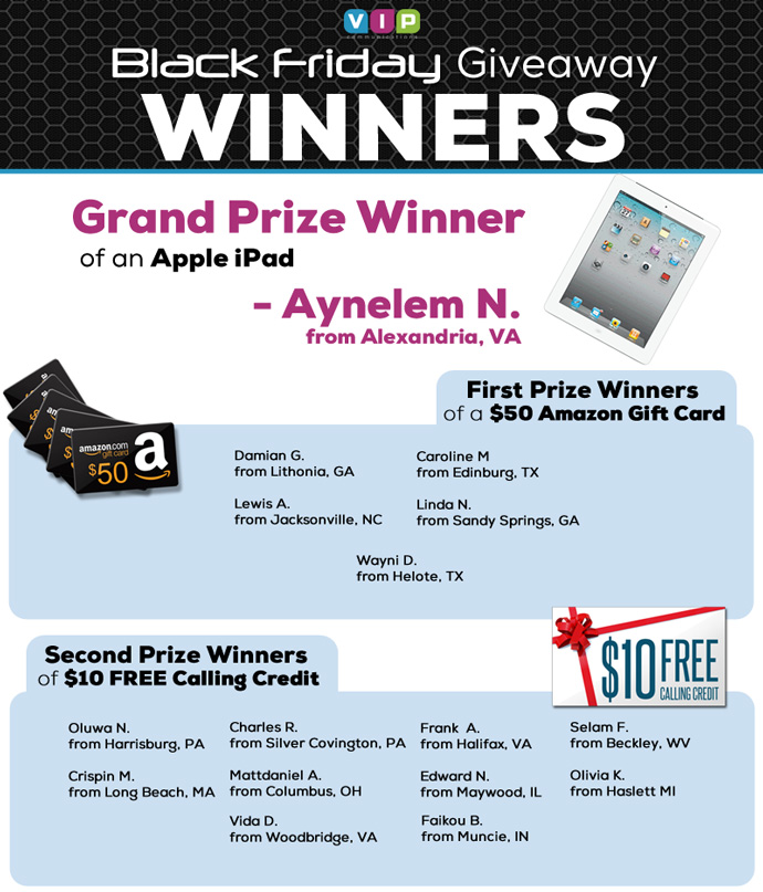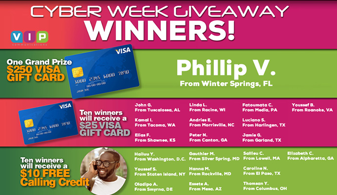 If you have family or friends living abroad, especially in countries throughout Africa, VIP communications helps you stay in touch with them more often for less money. Our free international calls are available for all countries around the world and we often bring you special promotions and offers to save even more when calling select countries. You’ll also benefit from our frequent holiday promotions, customer contests and Facebook specials that will help you save tons of money when calling abroad.