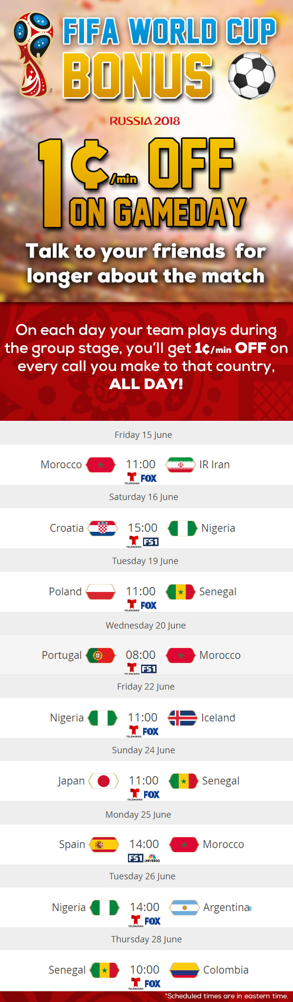 • 1¢/min OFF is only valid for Nigeria, Morocco, and Senegal for accounts on a standard rate plan from 12:00 am - 11:59 pm ET on each game day during the group stage.